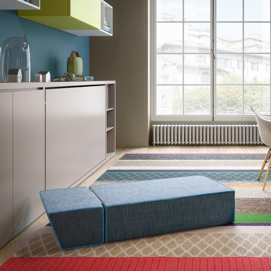 Sistema trasformabile Kali con letto singolo (90 cm) o intermedio (120 cm) a scomparsa, con rete a doghe brevettata CF09, testata tessile reclinabile e scrittoio maxi brevettato.