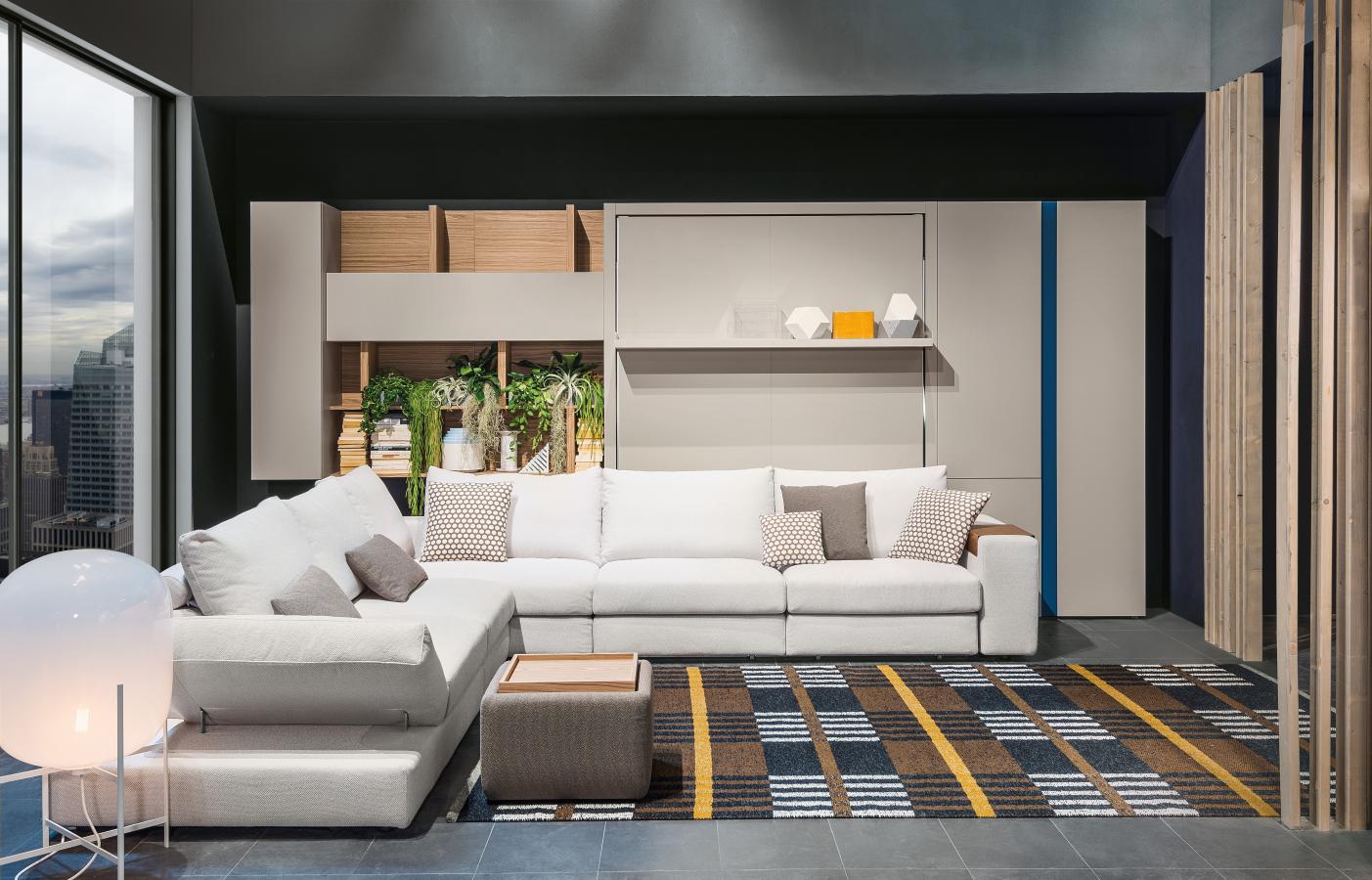 Tango è un divano realizzato nelle versioni fisso (L 223 cm e 270 cm) e componibile, integrato al sistema trasformabile, a doppia funzione, con letto matrimoniale a scomparsa ad apertura abbattibile. Il modello Tango con le sedute fisse e scorrevoli in entrambe le versioni (avanzamento sedute 20 cm) si compone con elementi modulari con e senza braccioli, angolari con contenitore, terminali con bracciolo reclinabile e penisole di varie dimensioni. Il divano viene realizzato anche in versione autonoma, svincolato dal sistema letto trasformabile, nelle misure L 190 - 223 - 270 cm. Sedute in piuma naturale con inserto in espanso indeformabile a quote differenziate, schienale imbottito in piumafill, fodere di rivestimento interno in cotone, rullo posteriore in espanso indeformabile. Rivestimento completamente sfoderabile. Il letto matrimoniale, sempre pronto, realizzato con l'innovativa rete a doghe CF97, con telaio in estruso di alluminio e sistema di regolazione integrato. Apertura e chiusura mediante maniglia fissa o estensibile posizionata sulla mensola frontale. Con l’apertura, la mensola bascula e diventa il supporto del letto a terra; il sistema consente di non rimuovere gli oggetti riposti sulla stessa.